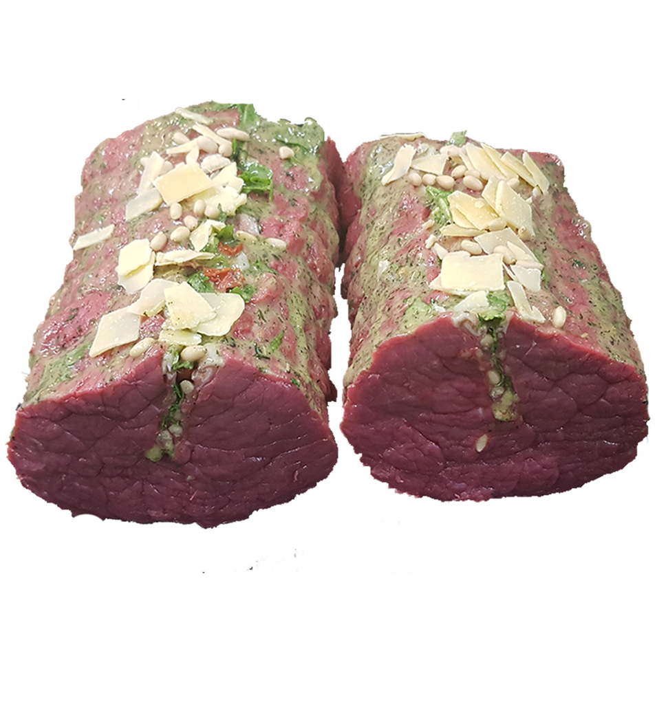 De carpaccio rollade is de Porsche onder de rollades. Malse rosbief gevuld met rucola, parmaham, pijnboompit en oude kaas. Wat is er nu mooier om de carpaccio rollade met de perfecte garing op tafel aan te snijden voor uw gasten. Wij rekenen 200gr per persoon Pan: 15 a 20 min per pond Oven: 3 uur 50 gr (controleren) in vacuumzak, 10 min 200gr of rondom bruin bakken in de pan Kern temperatuur: 48 – 53 graden